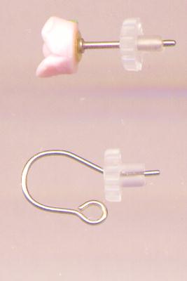 花がらのカタチをしたかわいい樹脂キャッチです。丸いイボみたいな樹脂キャッチが多いですが、これはかわいいですね。キャッチでも差をつけたい方におすすめ(笑)写真のように、フックタイプ(ひっかけタイプ)でもしっかりフィットします。見た目のかわいさ反面、実用的なたのもしいキャッチです。当店おすすめの樹脂キャッチです。