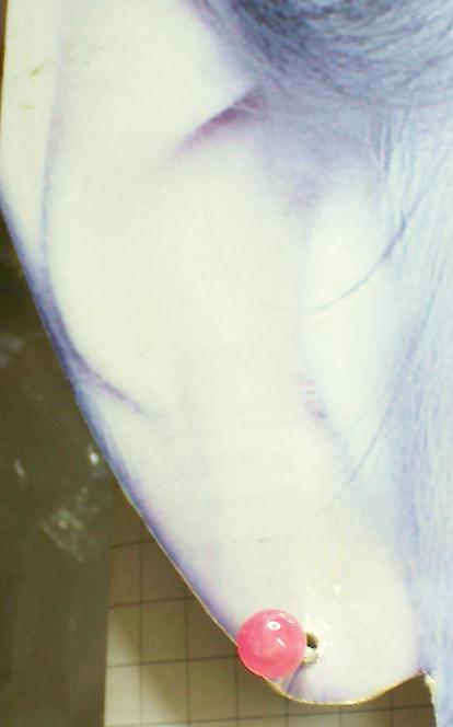 耳につけた状態では、石の横の白い縞や、表面の白い模様は目立ちません。かわいい赤いスイカのようです☆