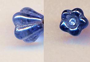 おはなはガラス製でございます(ガラスサファイヤ)。色はブルーベースで微妙にラメが入ったサファイヤいろです。お花の真ん中には淡いブルーのガラスが1粒ついています(控えめに光ります)