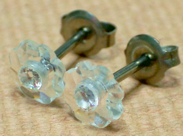 ホーム / 病院持ち込み用ファーストピアス / 1粒キュービックジルコニアつきお花デザイン(軸太16G太さ1.2ミリ純チタン製ロングタイプ)
