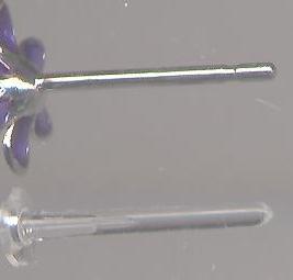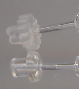 画像では軸が金属ですが、同タイプの軸が樹脂のものをお送りします。右の画像の下の軸が樹脂ピアス(樹脂ポストピアス)の軸です。太さ1ミリ前後ありますので、通常の太さのピアスがややきつい方ですと、樹脂ピアスは入りませんので注意が必要です。