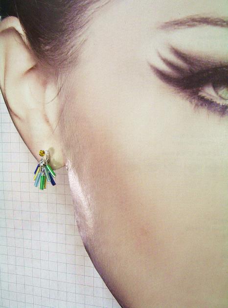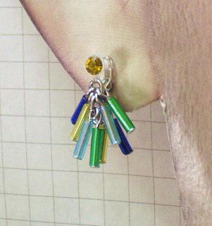 黄色い石の下で細いガラスが揺れるデザインです。黄色お月さまの下で花火が光っているように見えますよ(*^_^)
