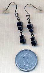 当店お馴染みのヘマタイト石のピアスです。こちらはサイコロみたいな四角いヘマタイトがつながったデザインです。ヘマタイトには血のめぐりをよくする効用があるそうで肩こりに効くらしいですよ(笑)