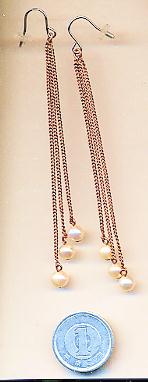 ほっこり淡水パールの秋色ロングチェーンピアスです。淡水パールが3個ついていますが、どのパールもきれいなまん丸ではなくて何だか微妙にゆがんでいます。じゃがいもみたい(笑)それが何とも暖かくてほっこりした感じで可愛いです。長めの秋色のチェーンとの相性もいいですね。チェーンは短く調整も出来ますのでご相談くださいませ。