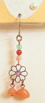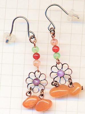 タテに並んだ3個の天然石の大きさは約3ミリです。 お花の真ん中についた天然石は 淡い紫色です。水晶とアメジストが ゆるく混ざったような感じの石で大きさは3ミリです。 お花の下で揺れる石ころみたいなキャラメル色の石は レッドアベンチュリンです