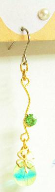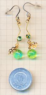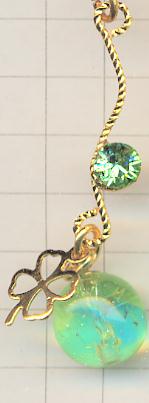 明るいグリーンがさわやかな春色ライムにラッキークローバーがついています。この春早々にもいいことがありそうですね(笑)はりがね細工のようなくるくるワイヤーが植物のつるみたいに見えます。ワイヤーにはライムガラスとお揃いのうすグリーンの一粒ガラスがついています。ワイヤーには細かいカットが入っていますので春の日差しで微妙に光って綺麗ですよ。春っぽくて心が浮かれ気分なピアスです。 炭酸ソーダみたいなライムガラスは涼しげで夏でもOK。