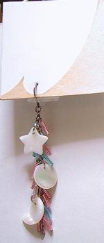 シェル(貝)でできたお花とお月さまと太陽のロングピアスです。丸い貝がついたロングピアスはこの時期によく見かける定番のデザインですが、恐らくだれかとかぶってしまうと思います。しかしこんな貝でできたお星さまやお月さまのついたピアスはちょっと見ないと思います。半透明のピンク色の糸ガラスが涼しげにしゃらしゃらゆれます。海につけてゆきたいですね。