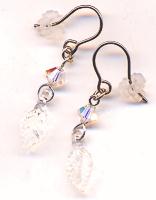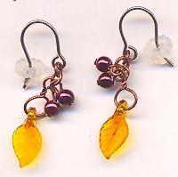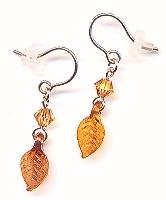 ちょっと派手な秋色リーフです。こげ茶色の晩秋の秋色リーフですが、木の実を連想させる華やかな赤や緑のガラスをまとってちょっとお洒落です。クリスマスカラーのピアスとしてもお使いいただけます。3色のガラスがゆれてかわいいですよ。