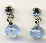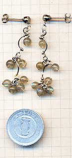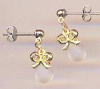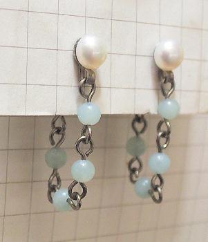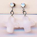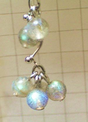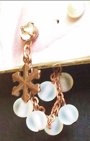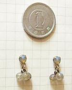 さらに詳しく&ご注文ページへピアスの軸の頭には半透明うすグレーのガラス(クリスタルガラス)がついてます。その下には3個の天然石水水晶がつきます。曇りガラスのようなフロスト加工がされています。3個の白い石がコロコロ揺れてかわいいですよ。ぼたん雪のようにも見えます(笑)クリスタルガラスの色合いと水晶の組み合わせがとても良い感じです。 ¥1300- |