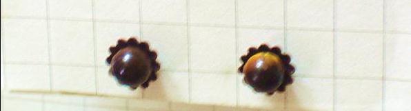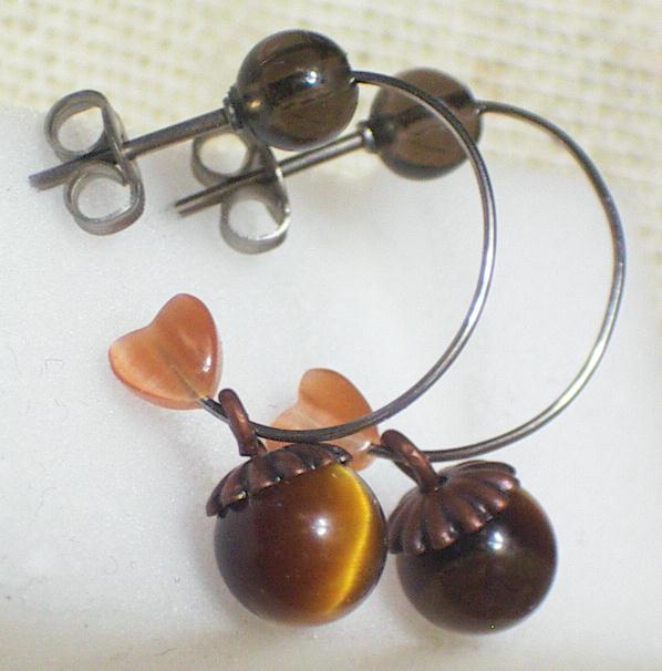 天然石タイガーアイのどんぐりピアスです。正面からみた画像をご覧ください。こんなにかわいいどんぐりが耳たぶの上にのっています。タイガーアイの独特の光り方がまさにどんぐりって感じですね。軸が長めですので知らない間にどんぐりころころしてしまう心配も少なそうです(笑) タイガーアイは決断力を高めてチャンスを逃さずに結果的に仕事運や金運を高める石としてしられています。つけているとチャンスをものにできるかも知れませんしできないかも知れません。。樹脂ピアスやイヤリング(ノンホールピアス)、セラミック軸のタイプもご用意できます(このピアスでもこれが可能になったのご紹介させていただきました。) 軸がセラミックや樹脂のタイプもございますが、その場合軸はロングタイプにはなりませんのでご注意ください。 |