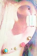 軸の長さ11ミリ、有効軸長8ミリ軸はチタンです。チタン軸とお皿部分にはメッキがかかっておりません。ファーストピアスのロングタイプとほぼ同じサイズですので耳が厚い方にもおすすめします。 軸がセラミックや樹脂のタイプもございますが、その場合軸はロングタイプにはなりませんのでご注意ください。 耳には耳掻き、当店おなじみの耳掻きピアスです(笑)こんなカラフルでキラキラでしたら耳かきも楽しそうですね。大きさ8ミリ見た目は小さなわっかのピアスのように見えます。 ピアスをあける時のファーストピアスと同じ長さですので、耳の厚い方でもつけていただけます。耳が大きくなってなければ。 |