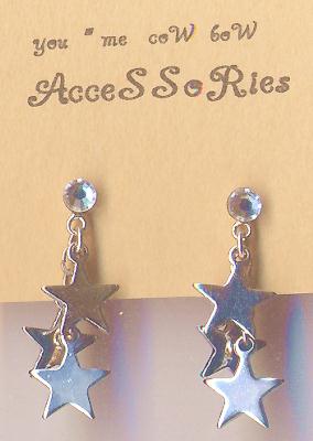 メタルのお星さまががシャラシャラ揺れるピアスです。ピアスの頭にはキラキラ透明なガラスがついています。手に持ってゆらして見てると目が痛くなります(笑)季節を問わずつけやすいピアスです。