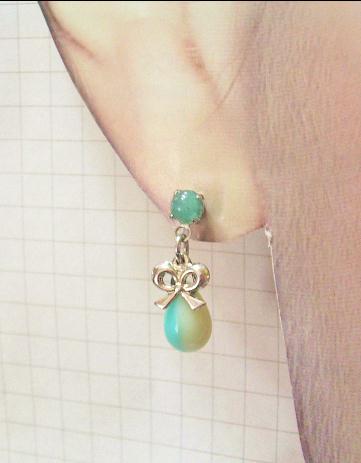ピアスの頭についた石は天然石グリーンアベンチュリンです。しずく部分はガラス製で色は不透明のうすグリーンとアイボリーのツートンでマーブルターコイズのような色合いです
