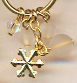 軸が長めのチタンロングピアスの軸の先に輪っかがついた『G型スタッドわっかタイプ』のチタンロングピアスです。つけていただくとわっかのピアスをしているように見えますよ。わっかの下には雪の結晶や天然石の水晶(くもりガラス風)が下がっています。金色の雪の結晶がキラキラ光り、1粒クリスタルガラスもキラリと輝き、さらに雪のように白い水晶がその光りを包みこんでしまうかのようです。これをつけて電飾でライトアップされた通りを歩くと素敵だと思いますよ。決して電飾に対抗しているわけではありません(笑)