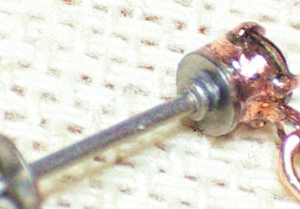 軸の部分には一切メッキがかかっておりません(純チタン)。市販品ですと軸の根本2-3ミリにもメッキがはみ出てかかっていることもあり、そのはみ出たメッキが、市販のチタン軸のピアスでアレルギーになりやすい原因だと思います。