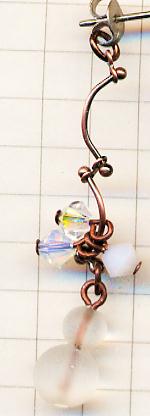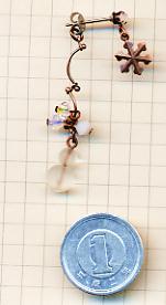 ピアスの頭には、冬にピッタリな半透明の白いガラスがついています。小さい茶色の4本爪でとまっていてかわいいですよ。そして耳たぶの後ろでは、くもりガラス風の天然石水晶で出来た白い雪ダルマが、くねくねのチェーンでくるくる揺れています(笑)