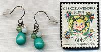 ターコイズはガラス製で、色は緑の強いターコイズブルーです。 2粒の丸い玉は天然石グリーンアベンチュリンとアマゾナイトです。
