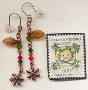 切手の大きさは3cm×2.2cmです(日本の切手と同じ大きさ) 秋色の雪の結晶ピアスです。葉っぱがついたロングピアスに茶色い雪の結晶がつき、雪の結晶が木の枝の一部分のようにも見えます。素敵ですね。