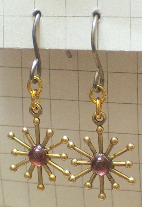 天然石ガーネットのついた華奢な雪の結晶ピアス~純チタンフック金具の揺れるピアス