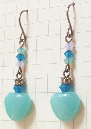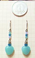 不透明みずいろのアマゾナイトハートが揺れるデザイン。ハートの上にはアマゾナイトとお揃いの小さくかわいいクリスタルガラスが縦に並んで揺れます。かわいいですよ。