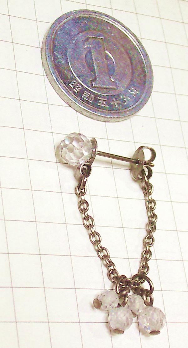 ファーストピアス(太さ1.2ミリ)と一般的なアクセサリーピアス(太さ0.6~0.7ミリ)の間くらいの太さですので、軸の細いアクセサリーピアスを着け始める前の練習用セカンドピアスとして最適な太さとなっています。金属部分すべて純チタン製でチタンメーカーにより加工された安全性の高い製品です。