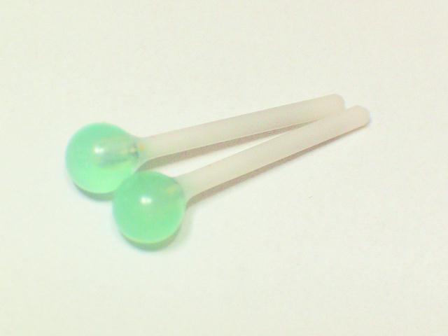 天然石クリソプレースのマッチ棒セラミックピアス半透明の淡いグリーン色のクリソプレースです。天然石ペリドットよりもさらに薄くてフロストっぽい半透明で、グリーンアベンチュリンよりもさわやかな明るい印象の石です。グリーン色の石は種類が少ないので貴重です。クリソプレースは10年以上前から当店で取り扱いしておりまして、当店でもお気に入りの石でございますが、年々入荷が少なくなっている石です。3ミリサイズは新入荷となります。石が小さくても、実際につけていただくと、ちゃんとクリソプレースのグリーン色がしっかり出ていますので、ものすごくかわいいと思います♪