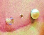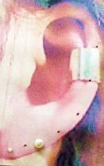 耳のイラストにつけてみた図です。デザインの都合でこの人ちょっと福耳です(笑)一緒についている白パールは大きさ4ミリです。
