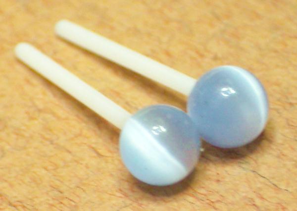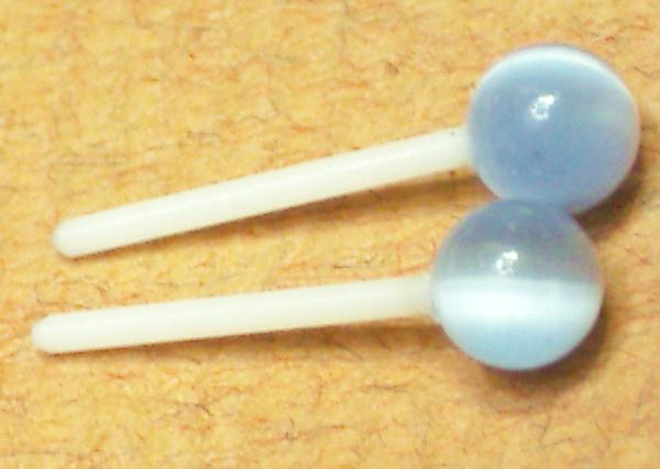 石はガラス製です。お色はうすブルー(みずいろ)・うすブルー2(白っぽい薄いブルーです)・白(半透明のしろ)・黒(真っ黒ではなく濃いグレーのような色)・オレンジ(みかん色)・うすアメ(うすむらさき)よりお選びいただけます。色の濃さには若干ばらつきがございます。