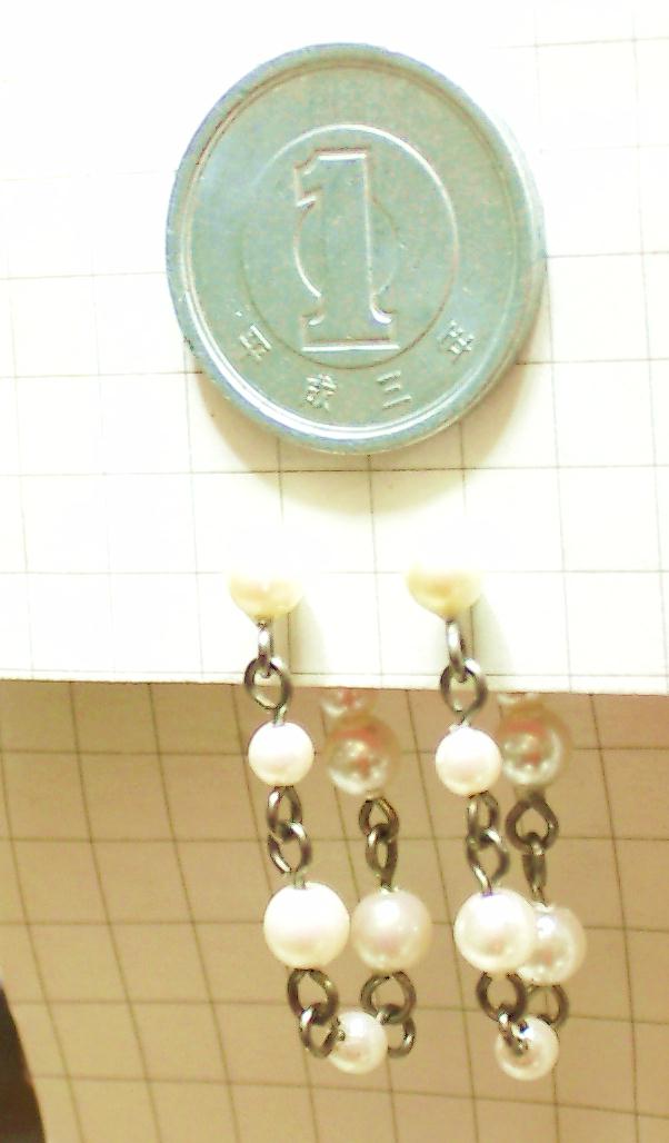 ピアスの頭のパールの大きさは4ミリです。揺れるパールの大きさは4ミリと4ミリと3ミリです。