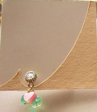 ひまわりのついたノンホールピアスの金具に、ピンク色のハート、夏色ライム、エメラルドみたいなよくひかるガラスがついています。春っぽい色合わせですがひまわりがついただけで一気に夏模様です。