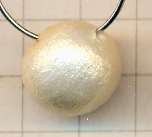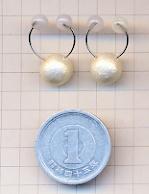 下で揺れているのはコットンパールです。大きさは8ミリです。色はホワイトです。白すぎず、黄色っぽくもない、自然な色合いの質感の高い白で高級感があります。コットンパールとは木綿を丸く圧縮して、パール調の塗料を塗ったものです。木綿素材ですので、大きさの割に、つけた感じがとても軽いです。また、ボールの表面には木綿の繊維の質感がうっすらと浮き出ており、通常のパールよりも、大人っぽい、アンティークな独特の雰囲気をお楽しみいただけます。
