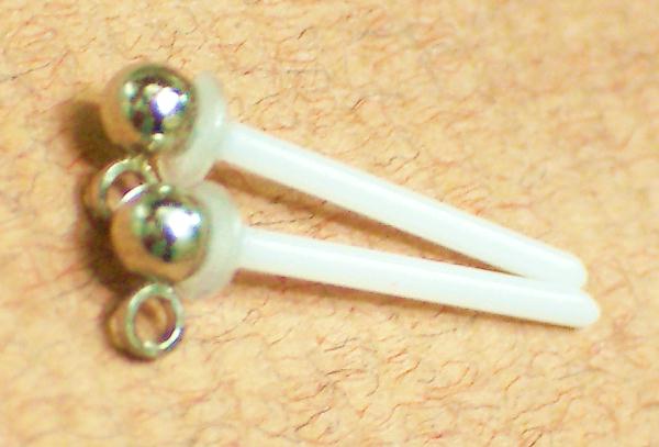 」のピアスです。樹脂の軸は金属や樹脂ピアスの軸に比べて表面がつるつるしていますので、太さの割にピアスホールに入れやすいのが特徴です。また金属のピアスと比べて軸の先端が丸く処理されていますので安全です。