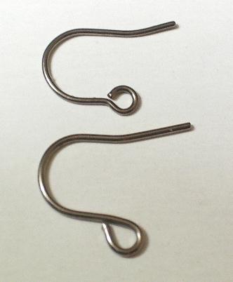 一般的なフックピアス金具(上)よりやや大きめで、余裕をもってつけられますので落ちにくいです。 軸もやや太さがあります。