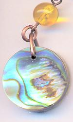アバロンはタテ1.5センチ程度です。アバロンの上の石(天然石コハク)は大きさ5ミリくらい、その上の色を違えた茶色っぽい5粒の石はクリスタルガラスで大きさ3ミリです。