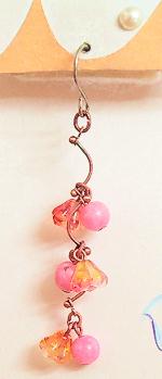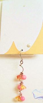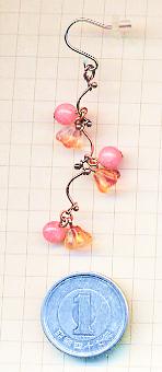 淡いサーモンピンクいろの石は天然石インカローズになります。大きさは5ミリくらいです。お花はガラス製で、くすんだ赤やくすんだ黄色の模様が入った半透明のお花です。秋に似合いそうなお色ですよ。