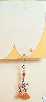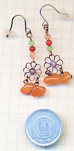 タテに並んだ3個の天然石の大きさは約3ミリです。 お花の真ん中についた天然石は 淡い紫色です。水晶とアメジストが ゆるく混ざったような感じの石で大きさは3ミリです。 お花の下で揺れる石ころみたいなキャラメル色の石は レッドアベンチュリンです