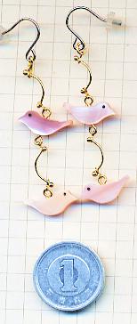 ◆◆貝を加工して作られた2羽のことりがヒラヒラと揺れて、仲良く飛んでいるように見えるピアスです。淡い薄紅色でかわいいですよ。ひよこサブレみたいなことりですよね(笑)