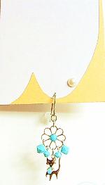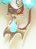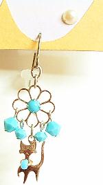 ターコイズが好きで好きでたまらない、おすましネコちゃんのピアスです。ターコイズ色のお花をつけて、おしゃれな首輪までつけてます。なんとくびわまでターコイズ色(笑)。ここまでやるかという感じですがターコイズ好きなネコちゃんの相当なこだわりが感じられるデザインですね(笑)。ターコイズはガラス製ですが見た目いい感じですよ。金属部分が金色タイプもございます。