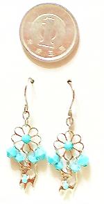 お花の真ん中のガラスターコイズの大きさは2.5ミリくらいです。お花の下には4ミリと3ミリのガラスターコイズがついています。