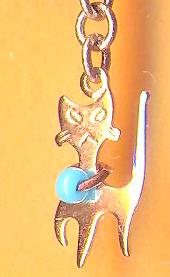 おすましネコちゃんにくびわがついています。お色はかざり部分がターコイズ(ガラス製)、くびわが茶色です。ほかにもかざりが白でくびわが金色などのお色もございます(近日中に画像を掲載します)