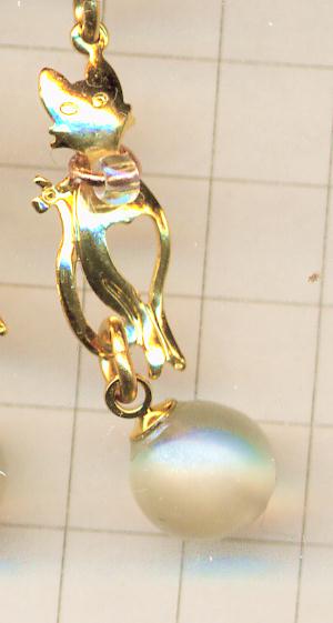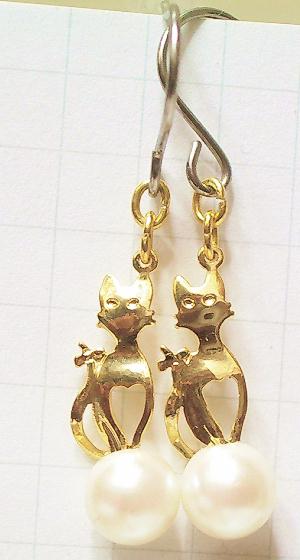 ◆◆パールの上におすまし顔のネコが乗ってるように見えるピアスです(笑)パールはネコちゃんの下に ぶら下がっているのではなく特殊な加工をしてネコに直結の形で直付けされていますので、 ネコちゃんと一緒に振り子みたいに揺れてかなりかわいいですよ(笑)
