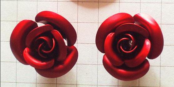 さらに詳しく&ご注文ページへお待たせしました(笑)口紅のような紅色の薔薇の花のピアスです。「真っ赤なバラ」のイメージにピッタリなピアスです。こんな感じの鮮やかな真っ赤な薔薇の花はなかなかないと思います。大きさは大きめ(15ミリ)です。 以前ご紹介しました深紅色の薔薇の花のピアス(13ミリ)よりもやや大きめです。アルミ製ですので大きさの割には軽くてつけやすいですよ。質感も良いものですのでプレゼントにもおすすめします。 |