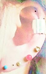 軸の長さ11ミリ、有効軸長8ミリ軸はチタンです。チタン軸とお皿部分にはメッキがかかっておりません。ファーストピアスのロングタイプとほぼ同じサイズですので耳が厚い方にもおすすめします。 軸がセラミックや樹脂のタイプもございますが、その場合軸はロングタイプにはなりませんのでご注意ください。 耳には耳掻き、当店おなじみの耳掻きピアスです(笑)こんなカラフルでキラキラでしたら耳かきも楽しそうですね。大きさ8ミリ見た目は小さなわっかのピアスのように見えます。 ピアスをあける時のファーストピアスと同じ長さですので、耳の厚い方でもつけていただけます。耳が大きくなってなければ。 |