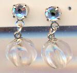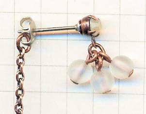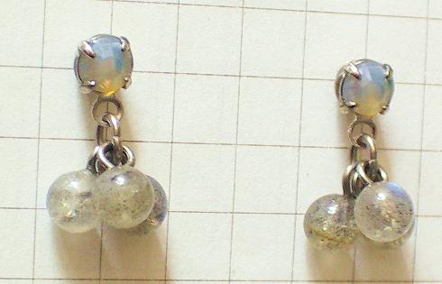 さらに詳しく&ご注文ページへピアスの軸の頭には半透明うすグレーのガラス(クリスタルガラス)がついてます。その下には3個の天然石水水晶がつきます。曇りガラスのようなフロスト加工がされています。3個の白い石がコロコロ揺れてかわいいですよ。ぼたん雪のようにも見えます(笑)クリスタルガラスの色合いと水晶の組み合わせがとても良い感じです。 ¥1300- |