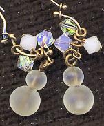 さらに詳しく&ご注文ページへピアスの頭には、冬にピッタリな半透明の白いガラスがついています。小さい茶色の4本爪でとまっていてかわいいですよ。そして耳たぶの後ろでは、くもりガラス風の天然石水晶で出来た白い雪ダルマが、くねくねのチェーンでくるくる揺れています(笑) 雪ダルマの上には白い雪がキラキラ光ながら降っているように見えるガラスがついています。このピアスがあれば暖かいお部屋のなかででも冬を満喫できますよ(笑) ¥1500- |