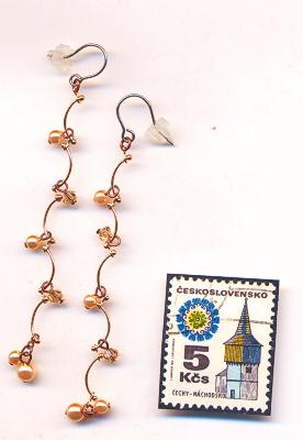 ↑ピンクゴールド色のチェーンに茶色の金具でパールと金色のガラスがついています。いちばん下はさくらんぼみたいにパール2個ついています。