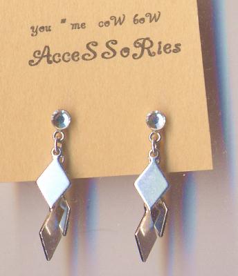メタルのひし形がシャラシャラ揺れるピアスです。ピアスの頭にはキラキラ透明なガラスがついています。手に持ってゆらして見てると目が痛くなります(笑)季節を問わずつけやすいピアスです。