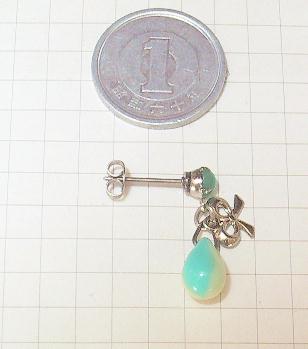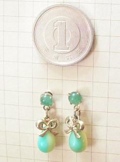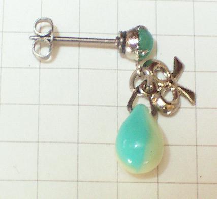 ピアスの頭についた石は天然石グリーンアベンチュリンです。しずく部分はガラス製で色は不透明のうすグリーンとアイボリーのツートンでマーブルターコイズのような色合いです
