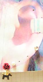 ころんとしたかわいいわんこモチーフのピアスです。まるでわんこがバラをプレゼントしてくれたかのような赤バラとのセットのデザイン。かなりかわいいと思います。ちょっと気取ったわんこピアスですね(笑)