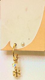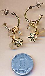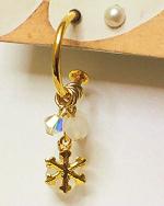 軸が長めのチタンロングピアスの軸の先に輪っかがついた『G型スタッドわっかタイプ』のチタンロングピアスです。つけていただくとわっかのピアスをしているように見えますよ。わっかの下には雪の結晶や天然石の水晶(くもりガラス風)が下がっています。金色の雪の結晶がキラキラ光り、1粒クリスタルガラスもキラリと輝き、さらに雪のように白い水晶がその光りを包みこんでしまうかのようです。これをつけて電飾でライトアップされた通りを歩くと素敵だと思いますよ。決して電飾に対抗しているわけではありません(笑)